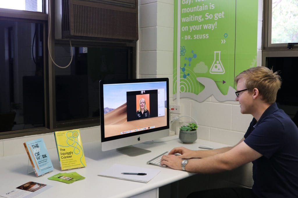 “This space has unlimited WiFi, a Mac computer with a built-in camera and microphone, Skype and Zoom already downloaded, access to the library catalogue and online resources, and most importantly it is in a quiet space.